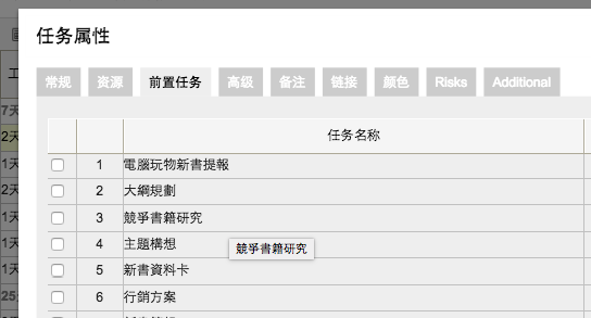 在列舉出專案裡的所有任務項目後,我們可以利用 Gantter 建立不同任務之間的依賴關係,在這裡簡體中文介面翻譯成「前置任務」,意思就是,設定要完成某個任務之前必須要先完成某個前置任務,反過來說則是:設定完成某個前置任務後,下一個相關任務才會開始。