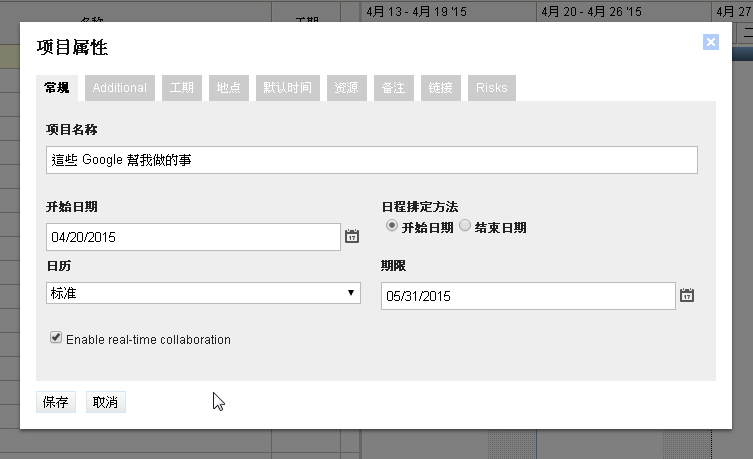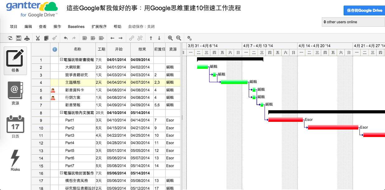 基本上滿足大多數的專案管理、甘特圖排程需求應該是足夠的,下面就讓我以最基本的排程步驟,來介紹如何上手 Google Drive 上的 Gantter 。