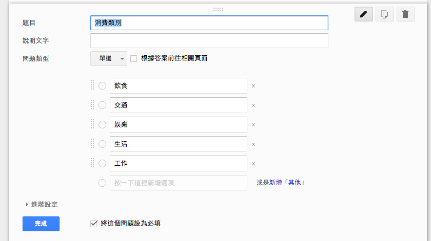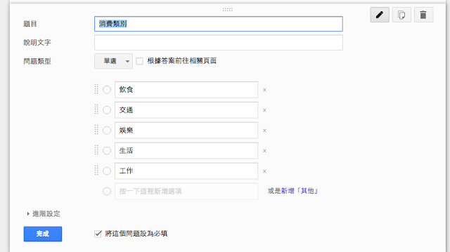 再來我們利用「單選」問題類型來建立消費類別,例如飲食、交通、娛樂等等,就像所有的記帳 App 那樣,事後就能透過消費類型的統計來分析自己的花費情況。