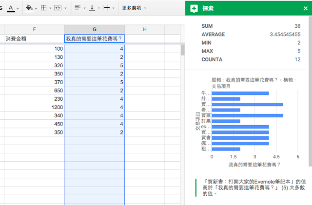 更進一步的,現在新版 Google 試算表右下方有一個「探索」功能,點擊這顆探索按鈕,就能任意查看每一個欄位相關的統計圖表。