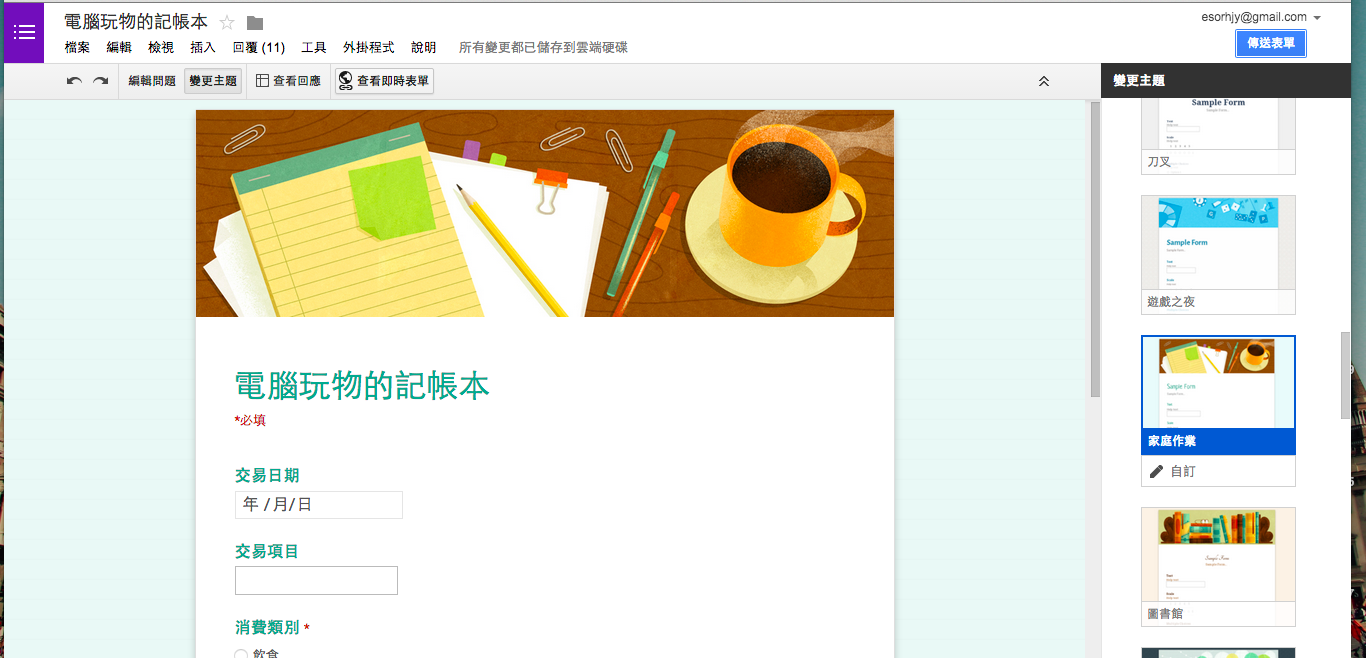 經過上面的問題設計,很快的我們就用 Google 表單設計出自己的便利記帳單,這時候別忘了還可以利用「不再只有醜醜範本!如何幫 Google 表單美化背景外觀?」來幫表單設計一個好看的問卷介面。