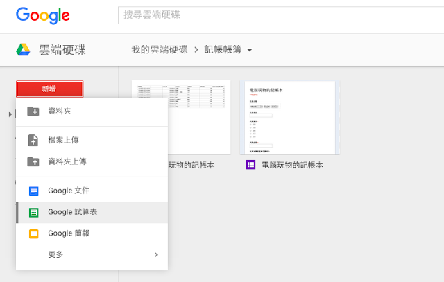 首先,打開你的「 Google 雲端硬碟」,我建議建立一個「記帳帳簿」資料夾來專門儲存以後的記帳表單資料。