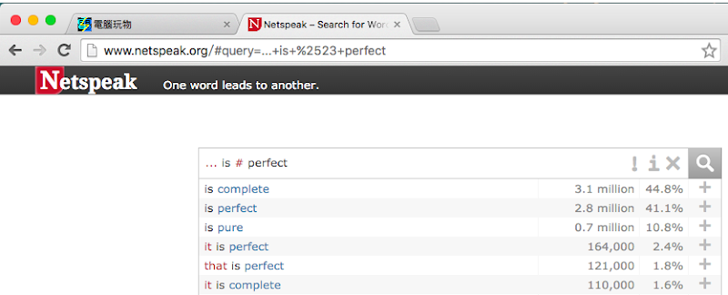比 Google 翻譯更好用的英文詞典資源,他的內容來自於網路上大家使用的英文詞組與語法用法,你可以在這裡找出網路上的英文流行說法,我們可能常常在寫英文信、英文訊息時,腦中有幾個關鍵的英文單字,但是要怎麼排列他們在片語、文法中的使用順序才對?如何加入動詞或介系詞串連出正確的句子?這些需求「 Netspeak 」也能幫上忙。