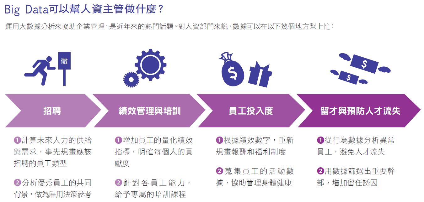 整體來說,完整的人力資源規畫除了招聘選才之外,還包含績效管理、員工投入度(engagement)和留才(retention)等工作,大數據到底能做些什麼?為什麼它可以成為有效的管理工具?