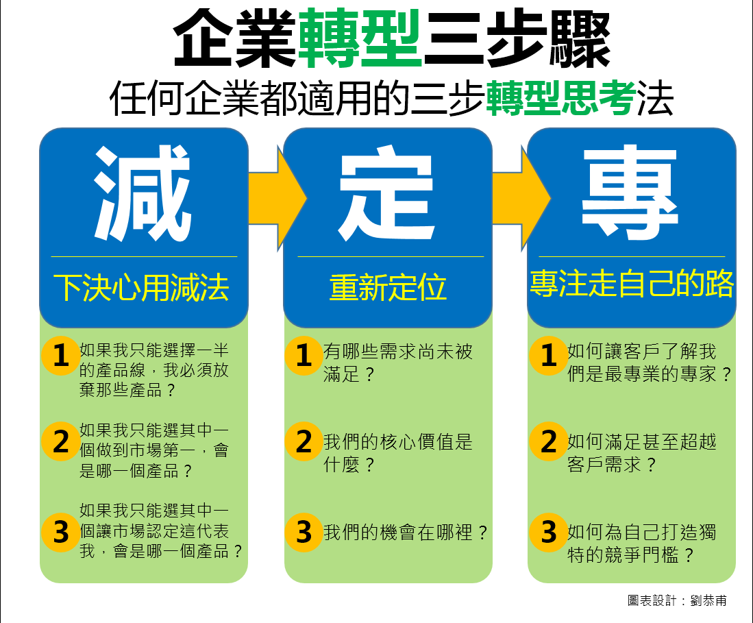 所以轉型第一步,就是重新檢視現有產品線,透過以下三個問題運用減法進行取捨: