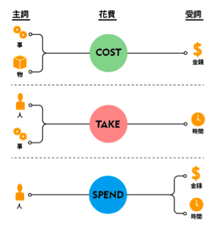 Spend、cost、take 這三個動詞用法常會搞混,是因為中文都翻成「花…」,可以是花時間或花錢。簡單來說,這三個字的用法可依主詞是人還是物,以及是用於花時間或花金錢,來歸納成以下圖表: