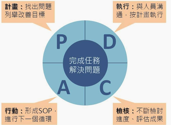 PDCA循環是一環環相扣的管理系統,通常用在改善生產流程上,由Plan(計畫)、Do(執行)、Check(檢核)、Action(行動)等4個步驟組成。在此循環中,從計畫到行動,前一個步驟的結果會影響到下一個步驟的推動,而最後的行動結果,又可以回饋給執行者,成為新的目標。