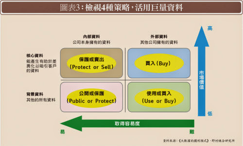 這類資料由於已存在於公司內部、容易取得,又是競爭對手很想拿到、市場價值極高的策略型資料,企業通常會將之歸類為「必須慎重保護」,絕不對外提供。不過,近來開始有些企業願意換個角度思考,「如果能為公司帶來極佳的利潤,不妨與其他企業策略聯盟共享或交換資料。」