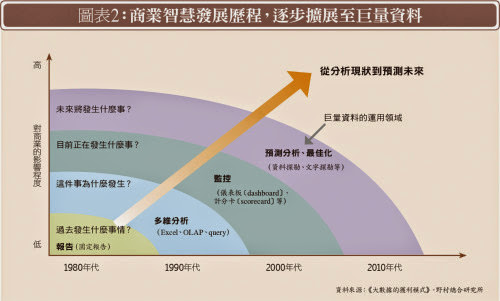 時至今日,商業智慧已歷經了不同的轉變,從1980年代以出具分析報告為主,目的在於了解「過去發生什麼事」;到1990年代,透過多維分析(例如Excel、線上分析處理[OLAP,On Line Transaction Processing〕、資料查詢[query〕),嘗試了解「這件事為什麼發生」;進入21世紀的第一個十年,則以監控(儀表板[dashboard〕、計分卡[scorecard〕)分析「目前正在發生什麼事」;到了2010年代,透過預測分析、最佳化(資料探勘、文字探勘等)的技術,預測「未來將發生什麼事」。