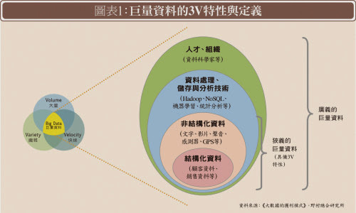 《大數據的獲利模式》指出,巨量資料狹義的定義是:「在3V(大量、龐雜、快速,簡稱「3V特性」)的層面上難以管理的資料,以及為了儲存、處理與分析這些資料的技術。」廣義的定義則是在狹義的定義之外,加上「為了分析這些資料,並且能夠從中萃取有用資訊或洞見的人才與組織」。