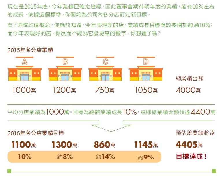 然而,實際上你對Lee下一季的期待,反而應該趨於保守,最好僅以平均值衡量,而不是期待他再創新紀錄。畢竟,單季業績突然大好是異常現象,多半帶有運氣成分在裡頭;反之,如果另一個業務員當季業績摜破底線,你最好也別因此大聲斥責,因為這也可能只是他時運不濟,下一季開始前,你反而要調高對他的期待。