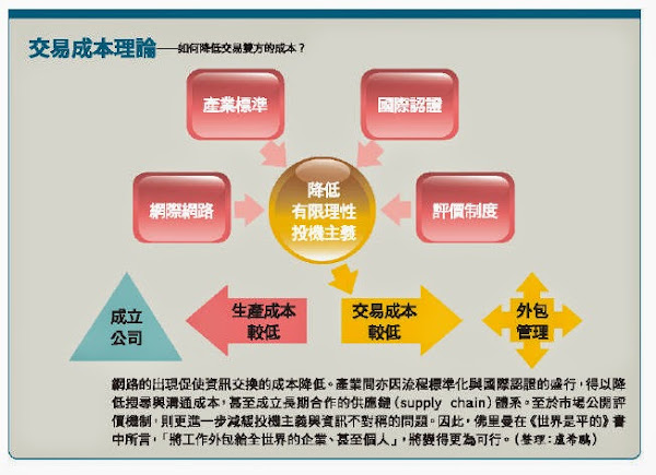 不過,隨著網際網路與CRM興起,這種狀況也隨之改變。 網路降低市場交易成本:網路除了促使企業內生產營運成本下降之外,也降低了資訊交換的成本。產業間亦因流程標準化與國際認證的盛行,得以降低搜尋與溝通成本,甚至成立長期合作的供應鏈(supply chain)體系。至於市場公開評價機制,則更進一步減緩了投機主義與資訊不對稱的問題。