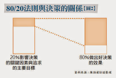 80/20法則可廣泛應用於各領域,包括提升個人與組織效率、增進公司收益等。元智大學社會暨政策科學系副教授陳勁甫指出,就決策而言,80/20法則是指決策者在分析問題時,必須剝開事物的層層表象,找出20%足以影響決策的關鍵因素和所追求的主要目標,如此就能有80%做出好決策的效果(見【圖2】)。