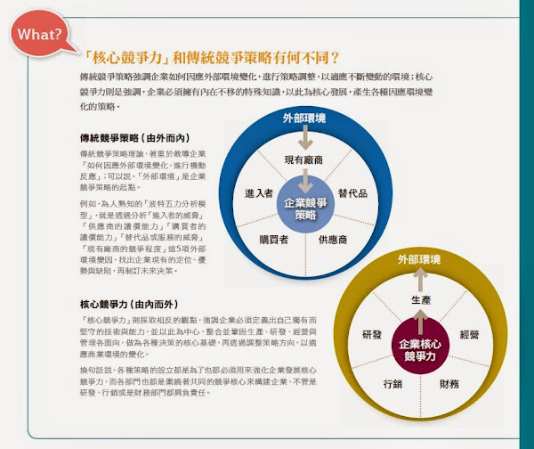 如蘋果(Apple)質感出色的「工藝美學」、新力(Sony)電子產品的「迷你化」、豐田汽 車(Toyota)製程的「持續改善」,都是該公司的核心競爭力,滲透進其組織文化中,創造 對手難以模仿、顧客高度期待的特色,從而讓企業在長期競爭中,始終保有優勢。