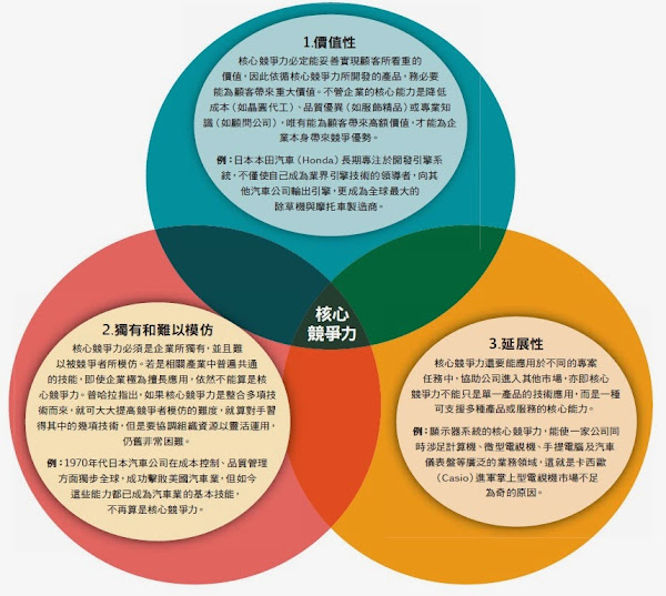 核心競爭力的壽命長於任何產品或服務,能為企業在市場上提供長期性、差異化的競爭能力。普哈拉和哈默爾在書中指出,企業要找出本身的核心競爭力,可以透過3個標準來辨識: