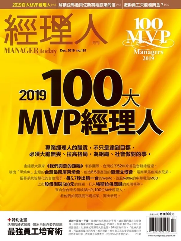 的確,一次高點無法保證未來績效,商業世界變動加快,企業反應只能更快,不斷創新且持續開拓新市場,才是長久優勢。2019年100 MVP經理人以此為準,網羅百位得獎者,從他們走出的路,看見超越競爭、突破逆勢的新機會。