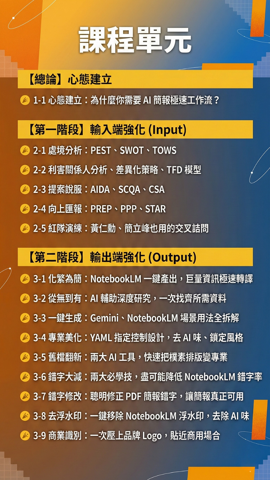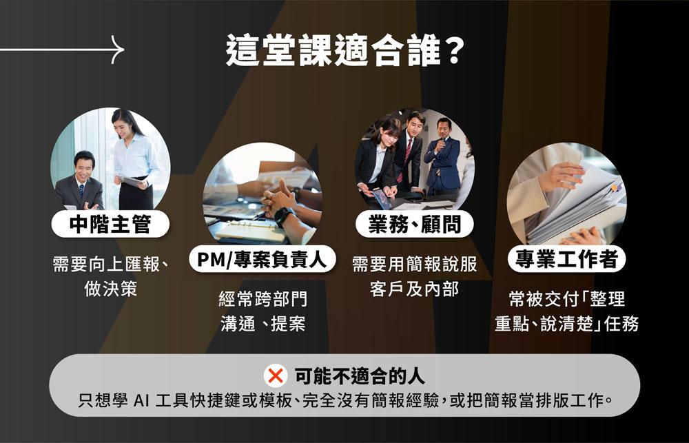 如果你總是花很多時間在做簡報,這堂課會幫你把時間與專業拿回來。用 AI,把簡報變成真正能幫助你做決策、說服他人的工具!