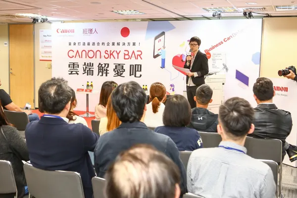 「Canon Sky Bar雲端解憂吧─二代出任務」之會後報導,與會者:引言人/經理人月刊總編輯 齊立文、企業代表/金色三麥集團執行長 葉冠廷、技術代表/Canon BIS 行銷處處經理 王友三
