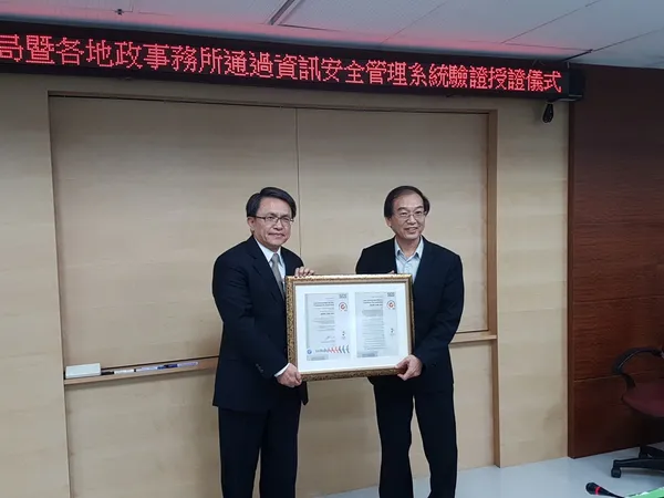 高雄市政府地政局及所屬12個地政事務所推動 ISO 27001資訊安全管理系統(ISMS)作業,經國際第三方公正機構(SGS台灣檢驗科技股份有限公司)稽核後,通過ISO 27001驗證並取得相關證書,由SGS 陳東明副總裁頒授「ISO 27001資訊安全管理系統」驗證證書予高雄市政府地政局黃進雄局長。