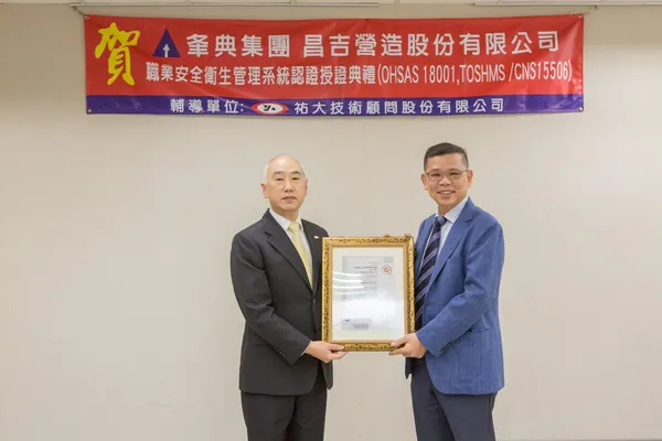 昌吉營造股份有限公司日前已順利通過職業安全衛生管理系統OHSAS 18001 (Occupational Health and Safety Assessment Series 18001)及TOSHMS (Taiwan Occupational Safety and Health Management System)雙重國際標準認證,顯見昌昌吉營造長期耕耘於職業安全衛生管理領域之努力,已獲國際驗證機構的肯定,具體展現昌吉營造不斷提升職業安全的決心與績效。